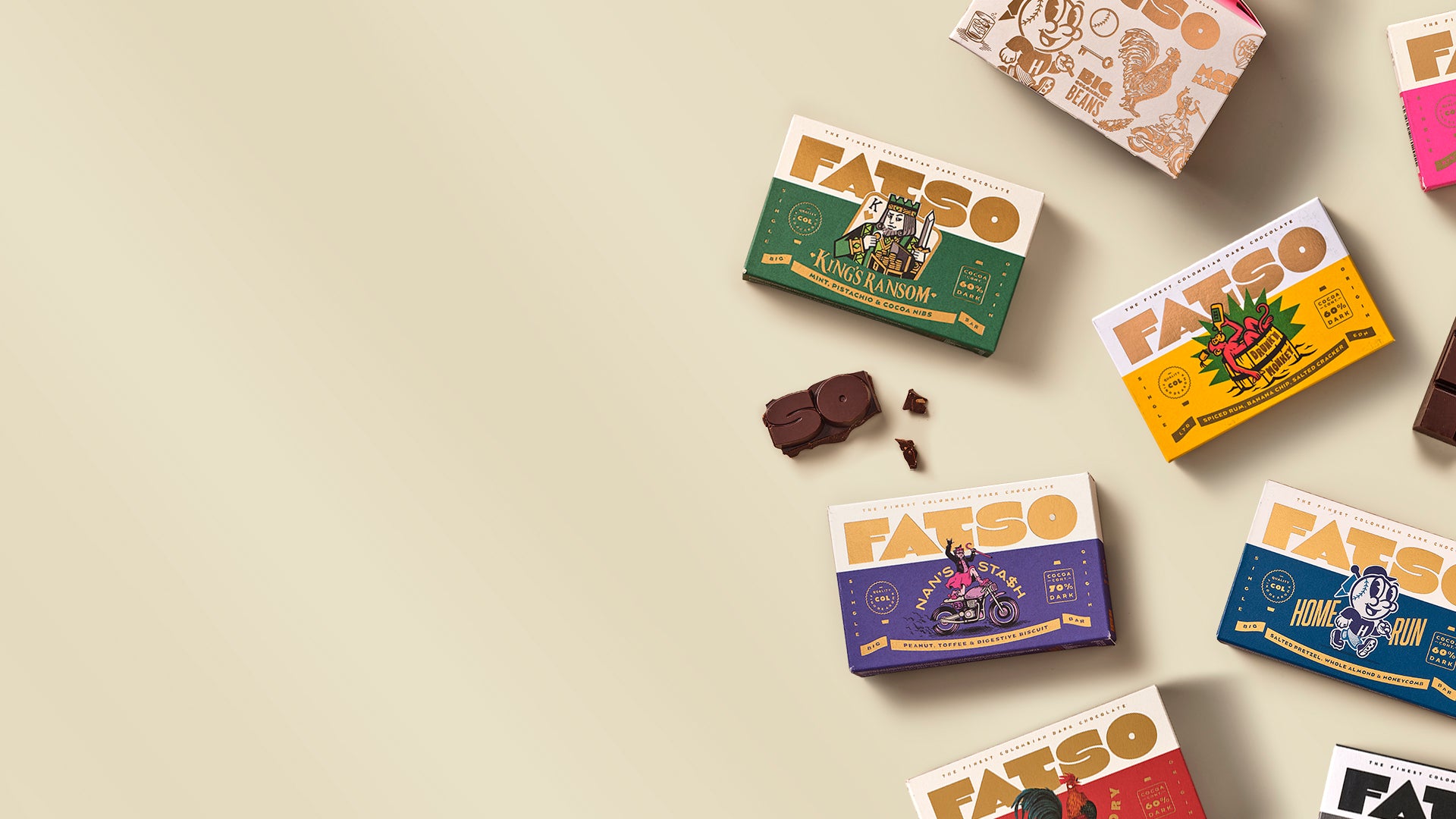 In a world of seriousness and restraint, we created FATSO to put an end to boring Dark Chocolate.We sourced the finest, single origin Colombian Dark Chocolate on the planet and made chunky bars packed with unreal flavour combos, and made it with a serious amount of ethical and sustainable goodness.